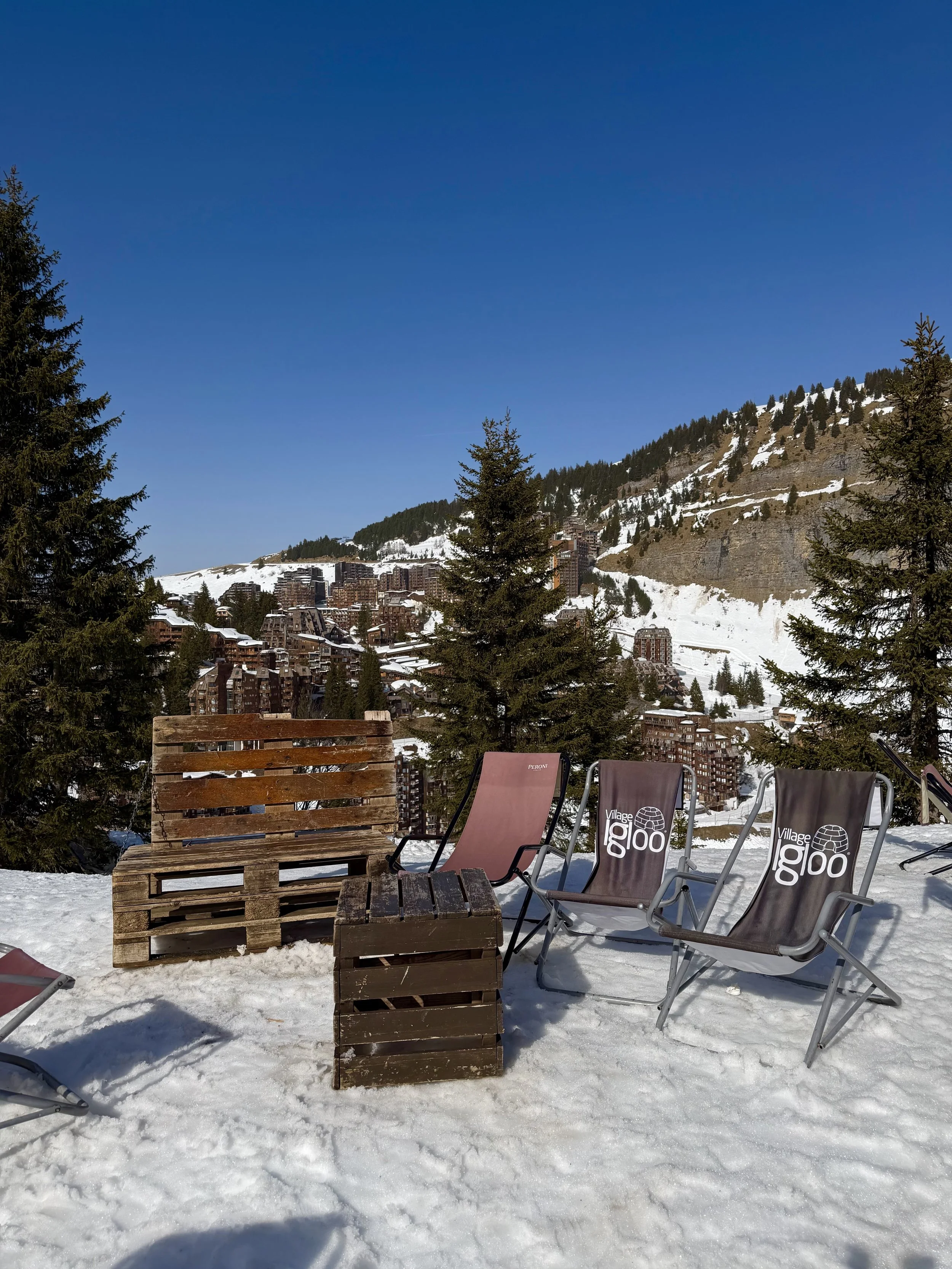 Sunchairs are super comfy and you’ll have a great view looking down over Avoriaz and restaurants Les Trappeurs Chez Flo, L’Express